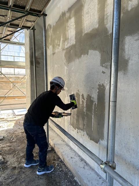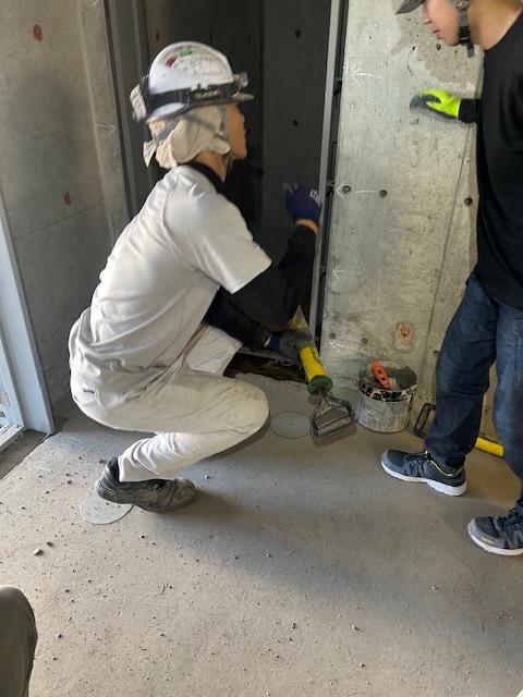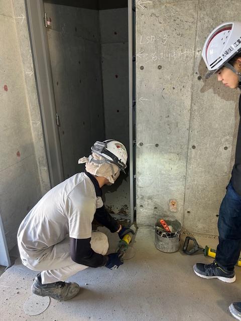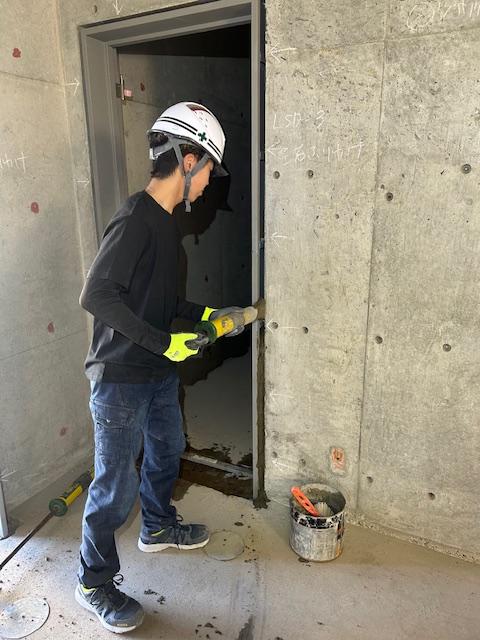 私 社長の指導のもと新人田原君が初の補修作業を行いました。